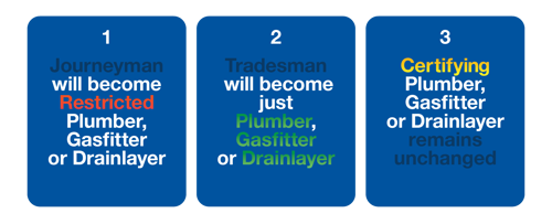 · Journeyman Plumbers, Gasfitters, and Drainlayers will become Restricted Plumbers, Gasfitters, and Drainlayers